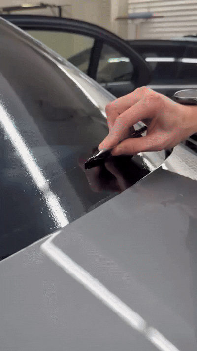 We clean the glass thoroughly and remove old film if needed.